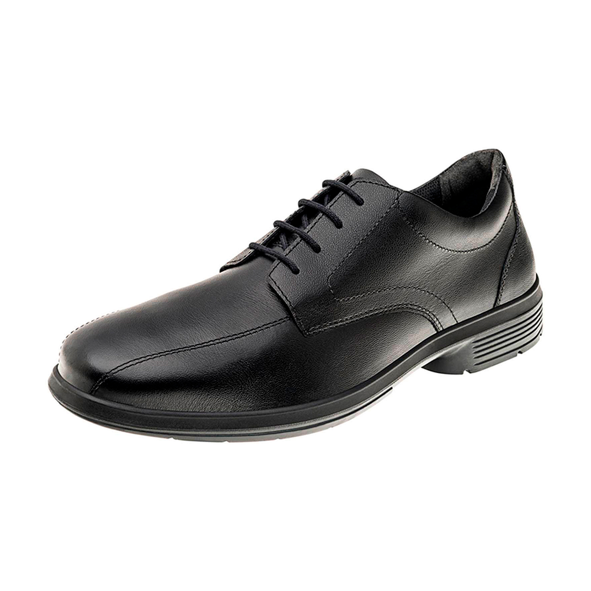 Calçado ocupacional, tipo sapato social, fechamento em cadarço, cabedal confeccionado em couro curtido ao cromo, palmilha de montagem em material sintético fixada pelo sistema strobel, forro da gáspea em tecido não tecido, forro lateral em tecido, solado em poliuretano bidensidade, injetado diretamente no cabedal, resistente ao óleo combustível e a absorção de energia no calcanhar. Certificado de Aprovação; 33698